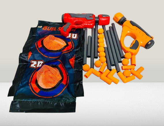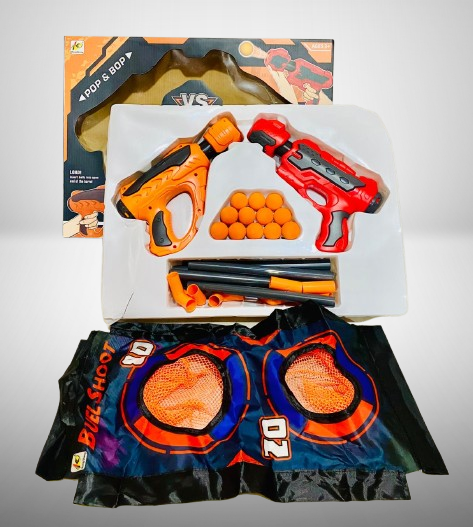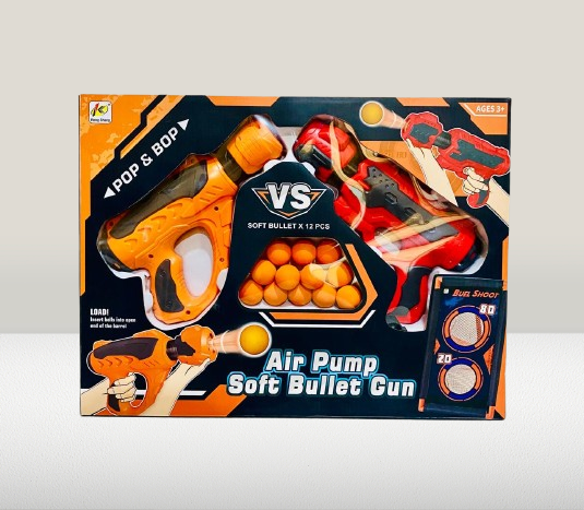 Gear up for a thrilling head-to-head battle with the Air Pump Soft Bullet Gun VS Set! This exciting toy set includes 2 colorful blasters (orange and red), 12 soft foam bullets, and a dual-score target board for endless hours of competitive fun. Designed with a safe air pump mechanism, the guns shoot soft foam balls that are kid-friendly and perfect for indoor or outdoor use.