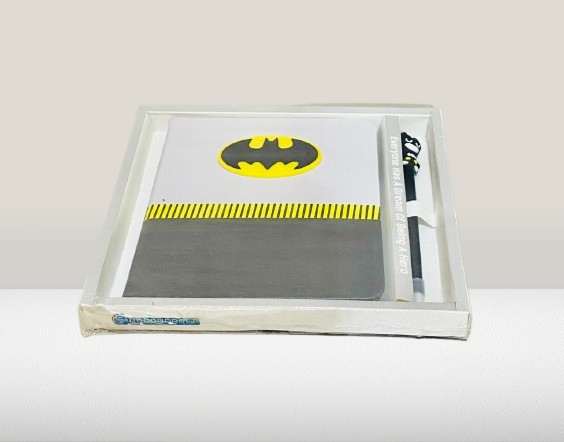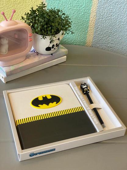 The notebook features the iconic Batman logo in bold yellow and black, with a stylish half-and-half design (white and dark grey), giving it a modern comic-inspired look. Alongside it is a matching black pen with a cute 3D Batman character topper, making writing even more enjoyable.
