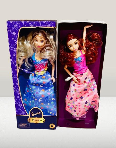 Let your child’s imagination soar with the Bernie Princess Doll Set! These two elegant dolls come dressed in beautifully designed satin-like gowns—one in a soft pink with floral butterfly prints and the other in a striking blue with colorful butterfly patterns. With long, flowing hair and cheerful expressions, these dolls are ideal for creative storytelling, dress-up games, and role play.