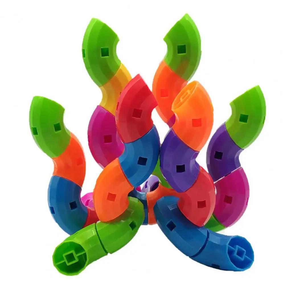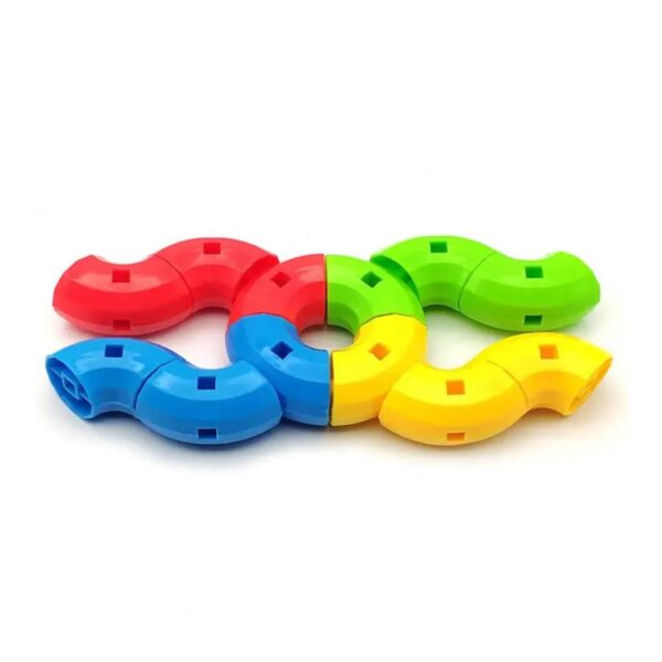 Unlike traditional square blocks, this set includes curved and interlocking pieces that allow for the construction of abstract 3D models, creatures, or complex designs. The bright red, blue, green, orange, and yellow colors make it visually stimulating and engaging.