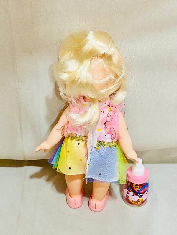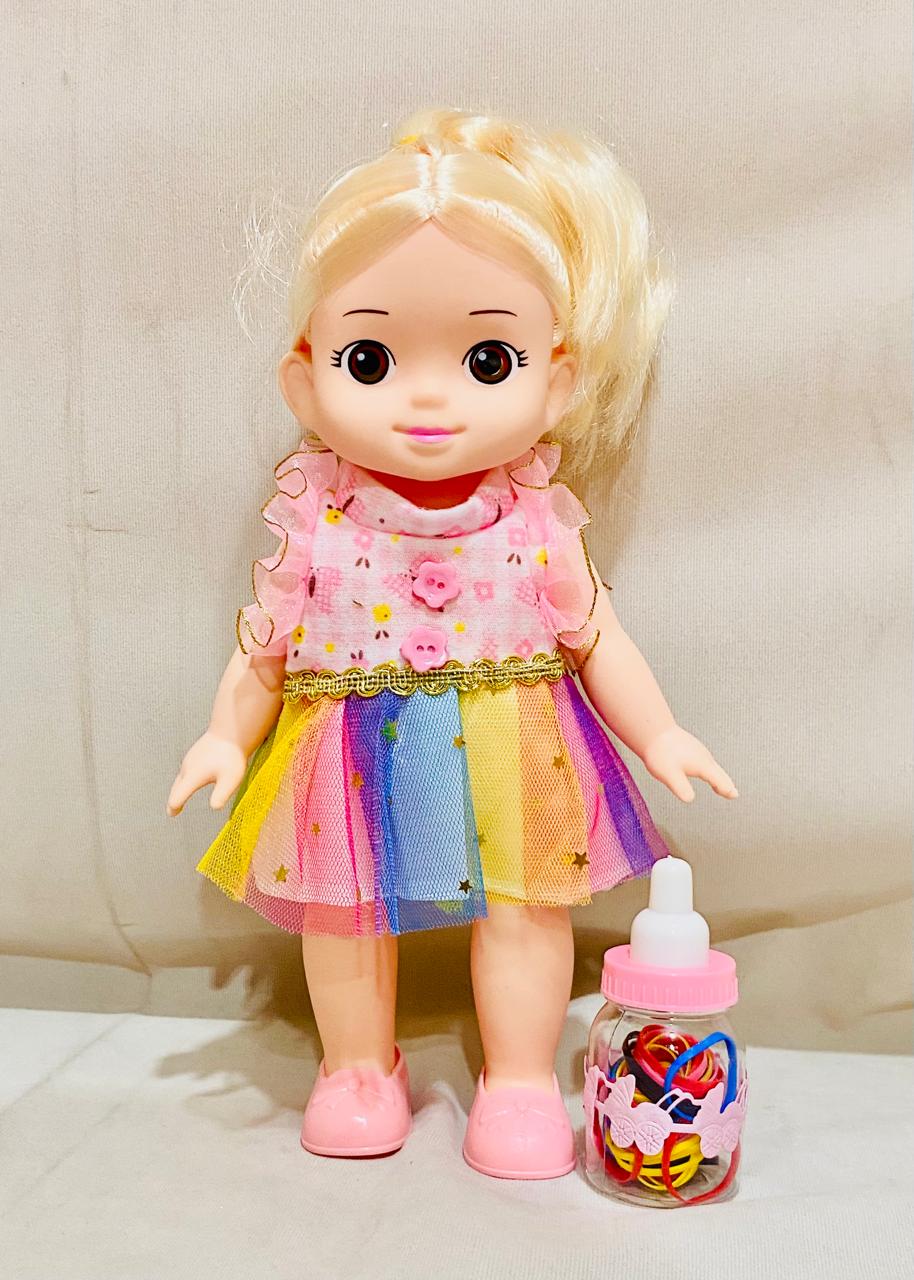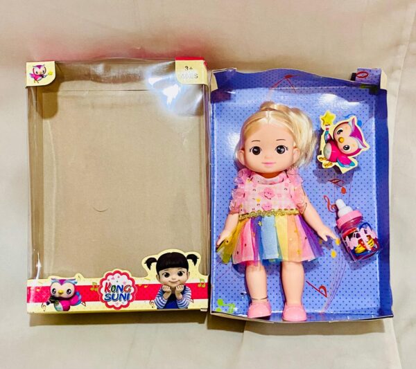 Bring home the charm and fun of the popular animated character with the Kongsuni Doll Set! Dressed in a vibrant rainbow dress with sparkling details, this adorable doll is designed to capture the hearts of young children. Featuring lifelike eyes, soft blonde hair, and a cheerful expression, Kongsuni is perfect for imaginative play. The set also includes a colorful baby bottle, making it great for nurturing and pretend-care activities. Made for kids this doll encourages storytelling, role-play, and emotional development in a fun and playful way.