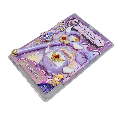 The Magic Stick Jewelry Set Series offers a delightful collection of fantasy-inspired accessories designed for children who love magical girl themes. This vibrant purple set includes a beautifully crafted magic wand adorned with wings and a red gem centerpiece, matching earrings, rings, and a compact with angelic wings. Each piece is detailed with gold accents and bright gems, perfect for role-playing and imaginative adventures. Ideal for children interested in cosplay, pretend play, or collecting magical-themed toys, this set sparks creativity and hours of fun.