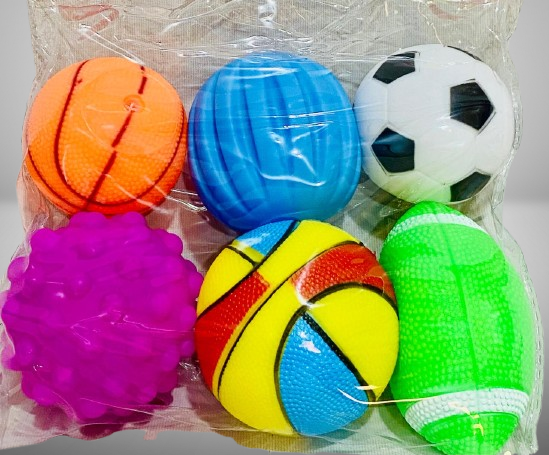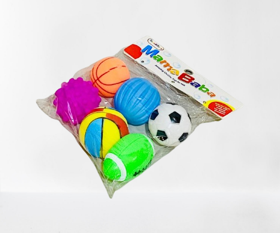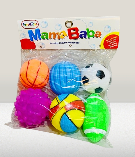 Brighten playtime with the “Mama Baba” mini ball set—six assorted, handheld toy balls in fun shapes like soccer, basketball, textured chew ball, and football-style oval. Crafted from soft foam or gentle rubber materials, these tactile balls are lightweight, non‑toxic, and sized to fit children’s hands comfortably. Ideal for sensory stimulation, hand-strengthening, and stress relief, they make fun party favors, classroom giveaways, or calm-down tools in playrooms. Suitable for kids These vibrant squishy balls encourage eye-hand coordination, imaginative play, and fine motor skill development.