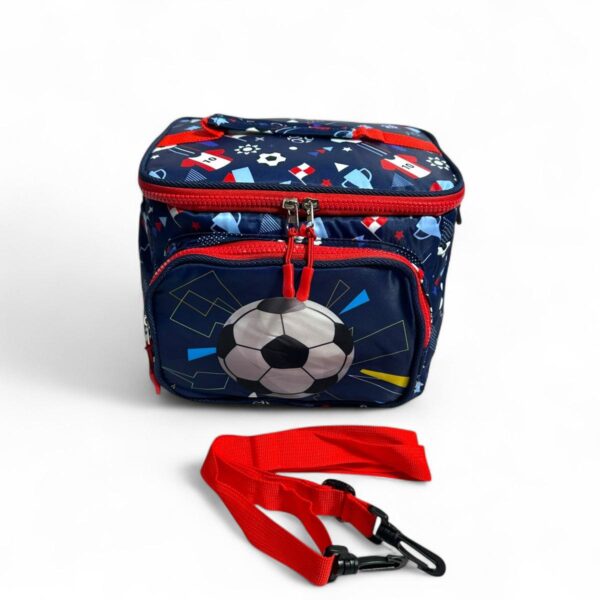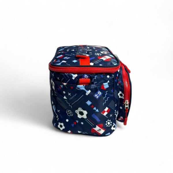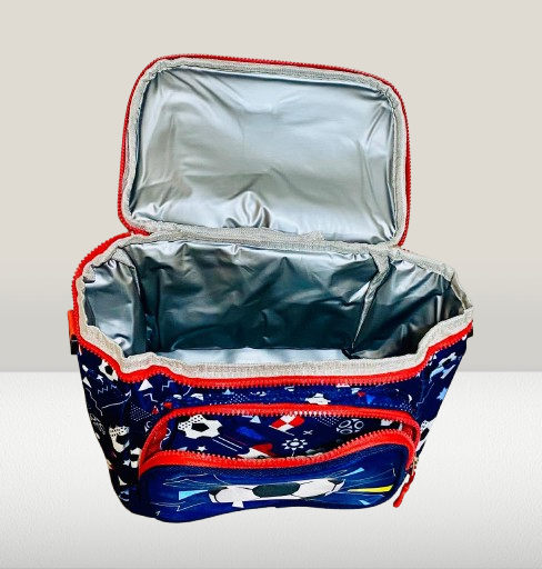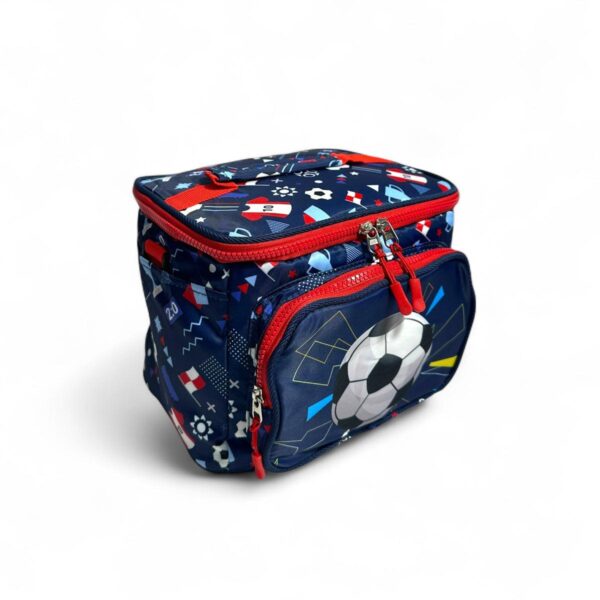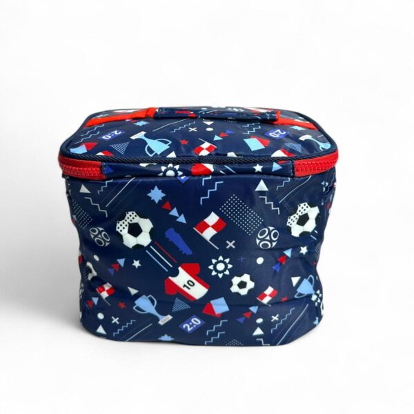 This sporty lunch bag is perfect for kids who are football enthusiasts. Designed with a deep navy-blue background and bright red zippers, it features scattered soccer ball graphics and dynamic geometric patterns. The front pocket showcases a bold 3D-effect soccer ball print. With an insulated inner lining to keep food fresh and a soft handle on top, it’s great for school, sports, or picnics.