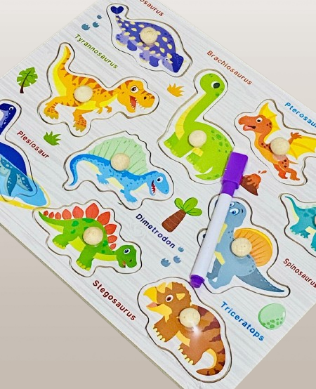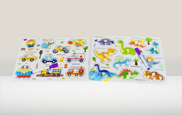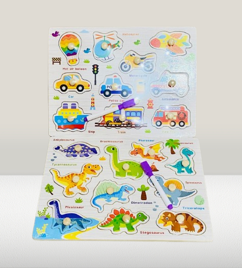 Introduce your child to the world of vehicles and dinosaurs with this interactive 2-piece Wooden Peg Puzzle Board Set. Designed for toddlers and preschoolers, each puzzle piece comes with a wooden peg handle to support little hands in improving their grasping skills, fine motor development, and cognitive abilities.